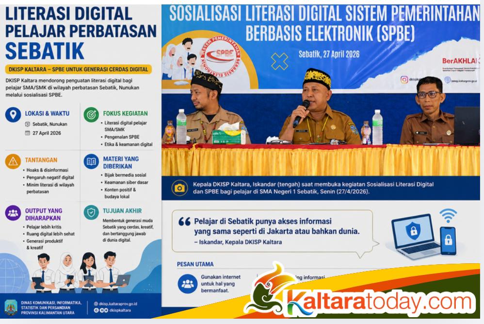 Program ini dijalankan lewat sosialisasi Sistem Pemerintahan Berbasis Elektronik (SPBE) di SMA Negeri 1 Sebatik, Senin (27/4), yang dibuka Kepala DKISP Kaltara, Iskandar, mewakili Sekprov Kaltara.